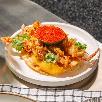 Soft-shell crab, local mud crab, mango, aligue-sofrito mayo, lime & togarashi, tostada